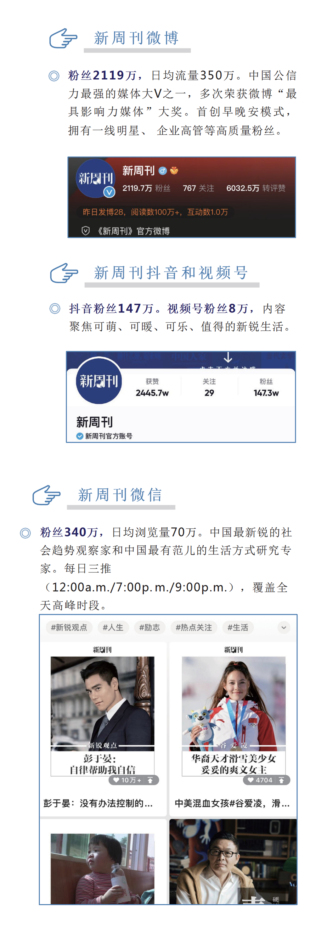 《新周刊》作(zuò)為(wèi)中國(guó)最新銳的(d☆β♥<e)生(shēng)活方式周刊,推出了(le)一(yī)系列廣受歡迎 ±¥的(de)原創話(huà)題和(hé)深度報(bào)道(dào),成為(wèi)一(yī)個(∞¶↓gè)時(shí)代的(de)體(tǐ)溫計(jì)。在移動互聯™•網時(shí)代,《新周刊》已發 展成擁有(π¶★ yǒu)千萬級粉絲基礎的(de)文(wén)化(huà)IP,是Ω≥(shì)集雜(zá)志(zhì)、新媒✔'✔Ω體(tǐ)、活動、圖書(shū)出版與整合營銷為(wèi)一(yī)體(tǐ)₩∞、極具全國(guó)影(yǐng)響力的(de)全媒體(tǐ)傳播平台。